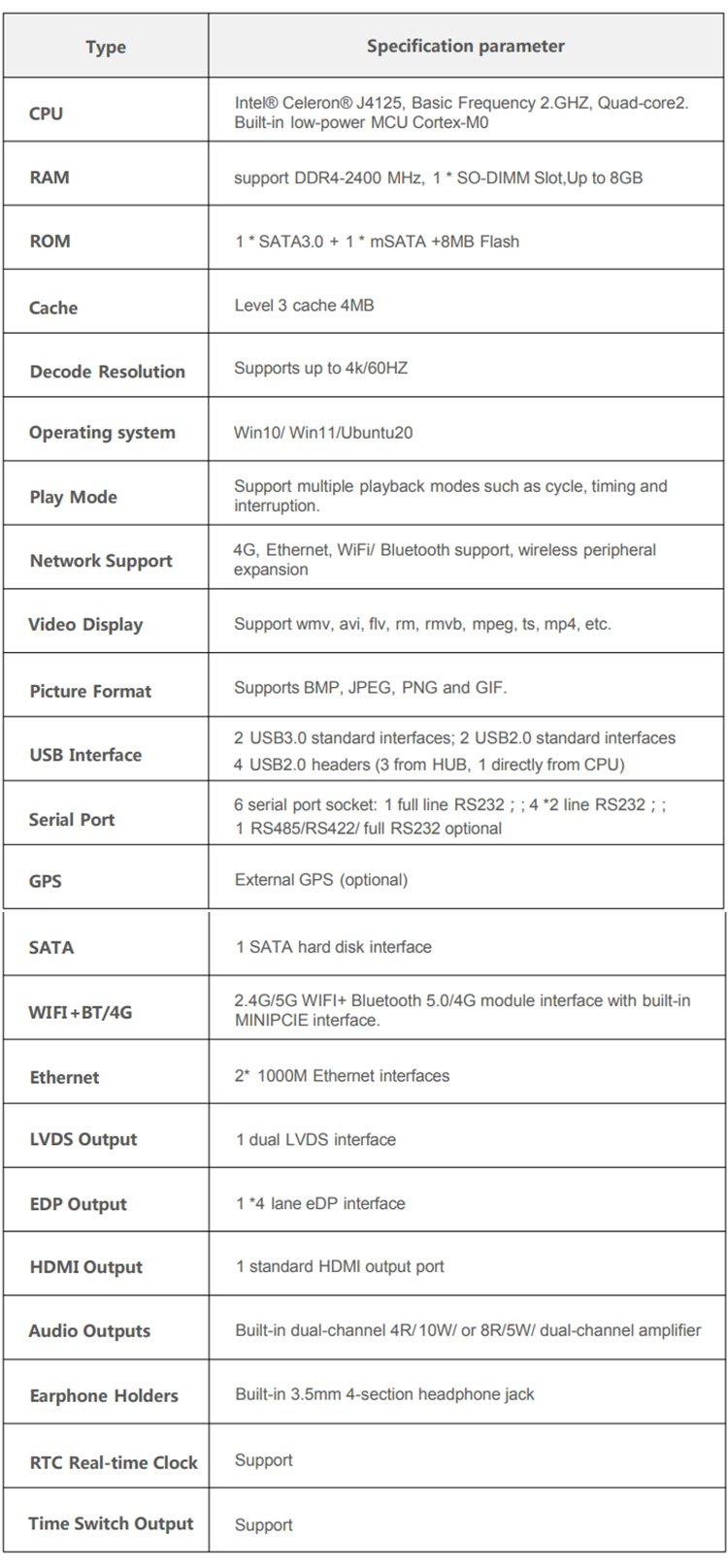 CPU | Intel® Celeron® J4125, Basic Frequency 2.GHZ, Quad-core2. Built-in low-power MCU Cortex-M0 |