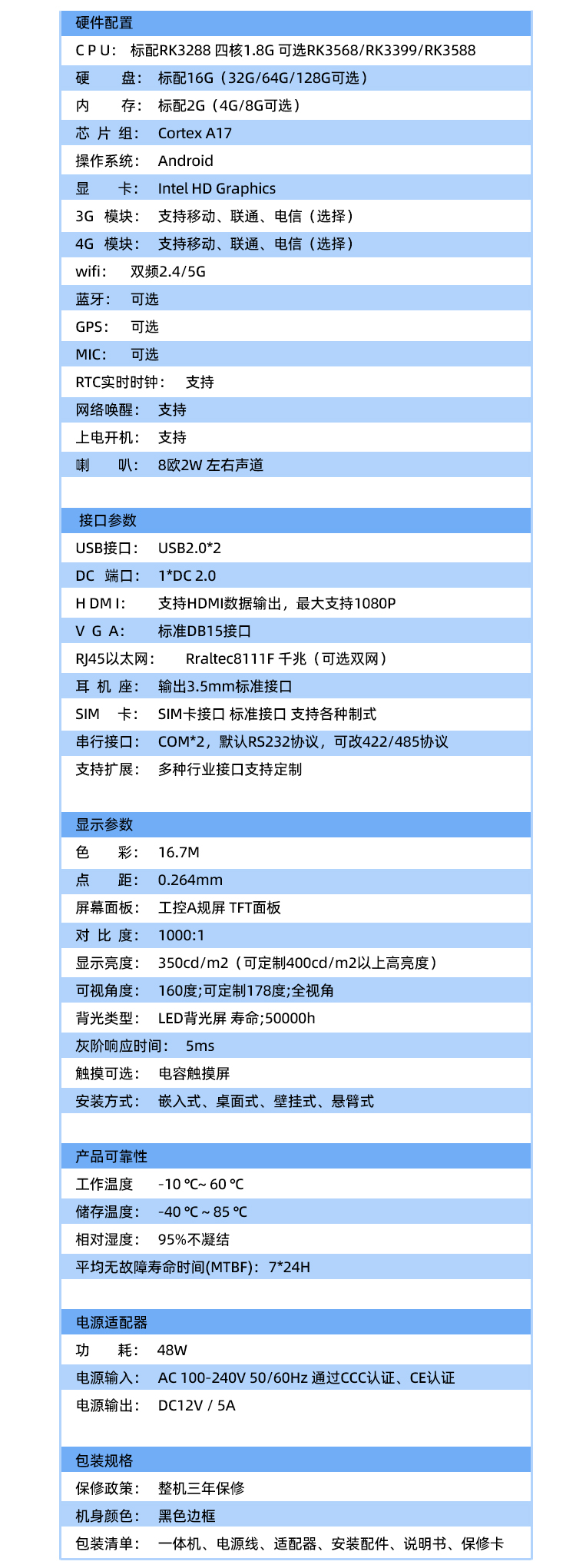 CPU | 標配:RK3288 四核1.8G 可選RK3568/RK3399/RK3588 |